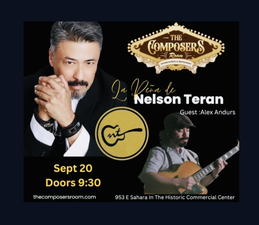 La peña de Nelson Teran en The Composers Room en Las Vegas: Una sala de espectáculos de primer mundo aloja la voz contundente e impecable del cantor tamaulipeco. Si están de visita por la ciudad del pecado, vengan a disfrutar de las voces y ritmos de la peña tradicional latinoamericana, con un anfitrión de lujo: el cantor Nelson Teran, originario de Matamoros, Tamaulipas, México y sus artistas invitados.