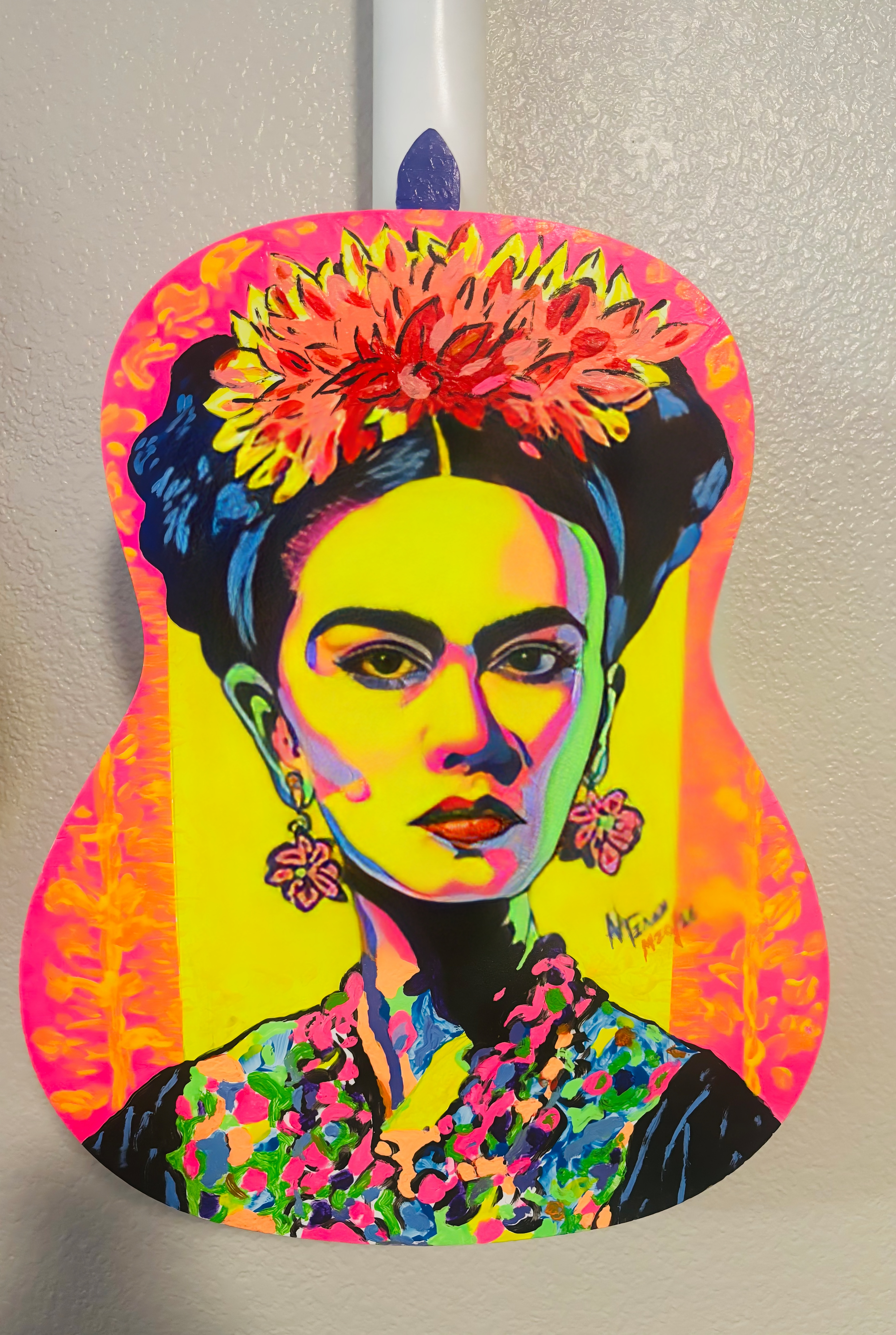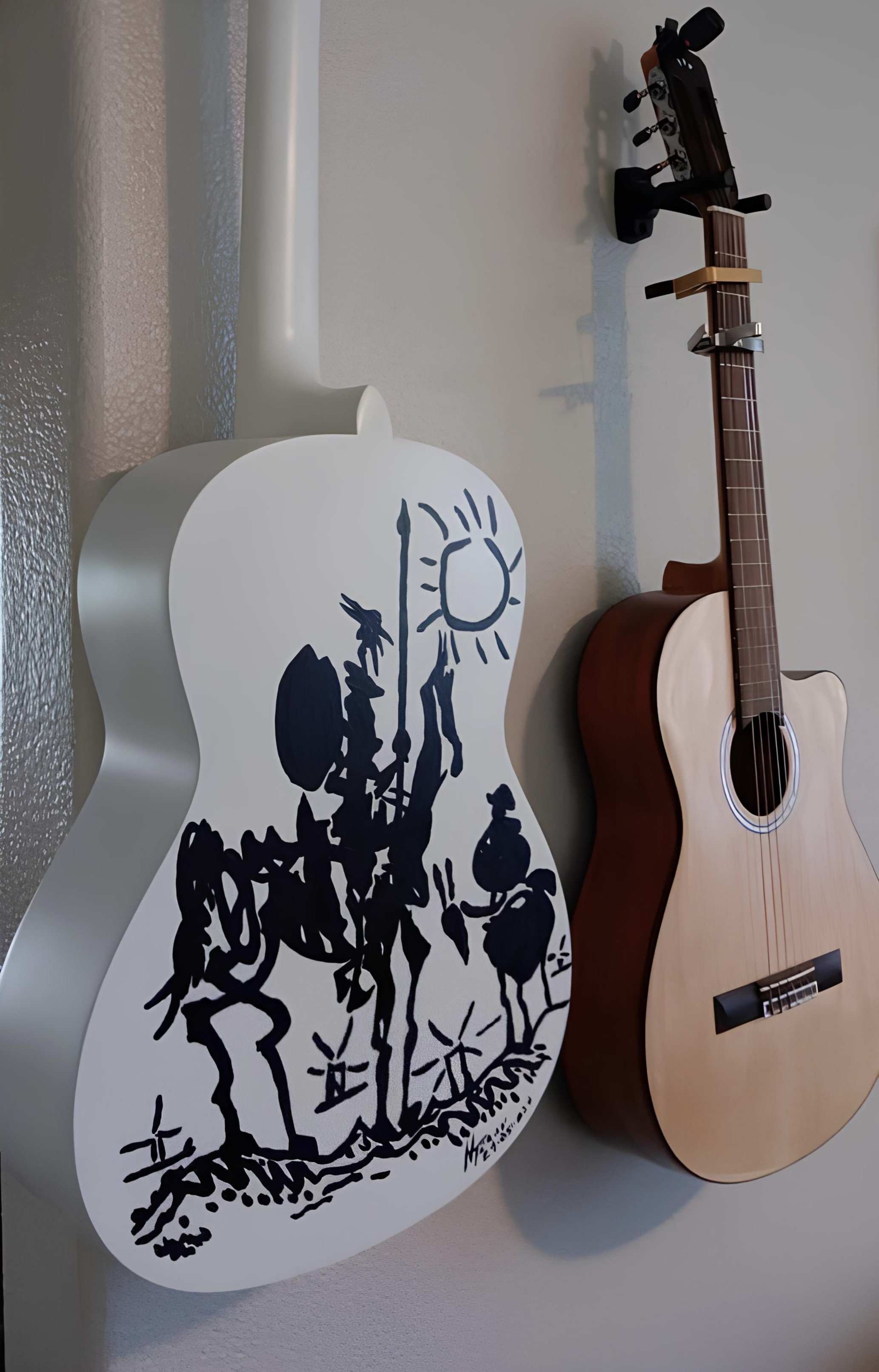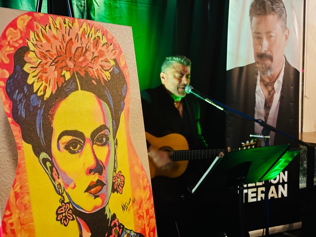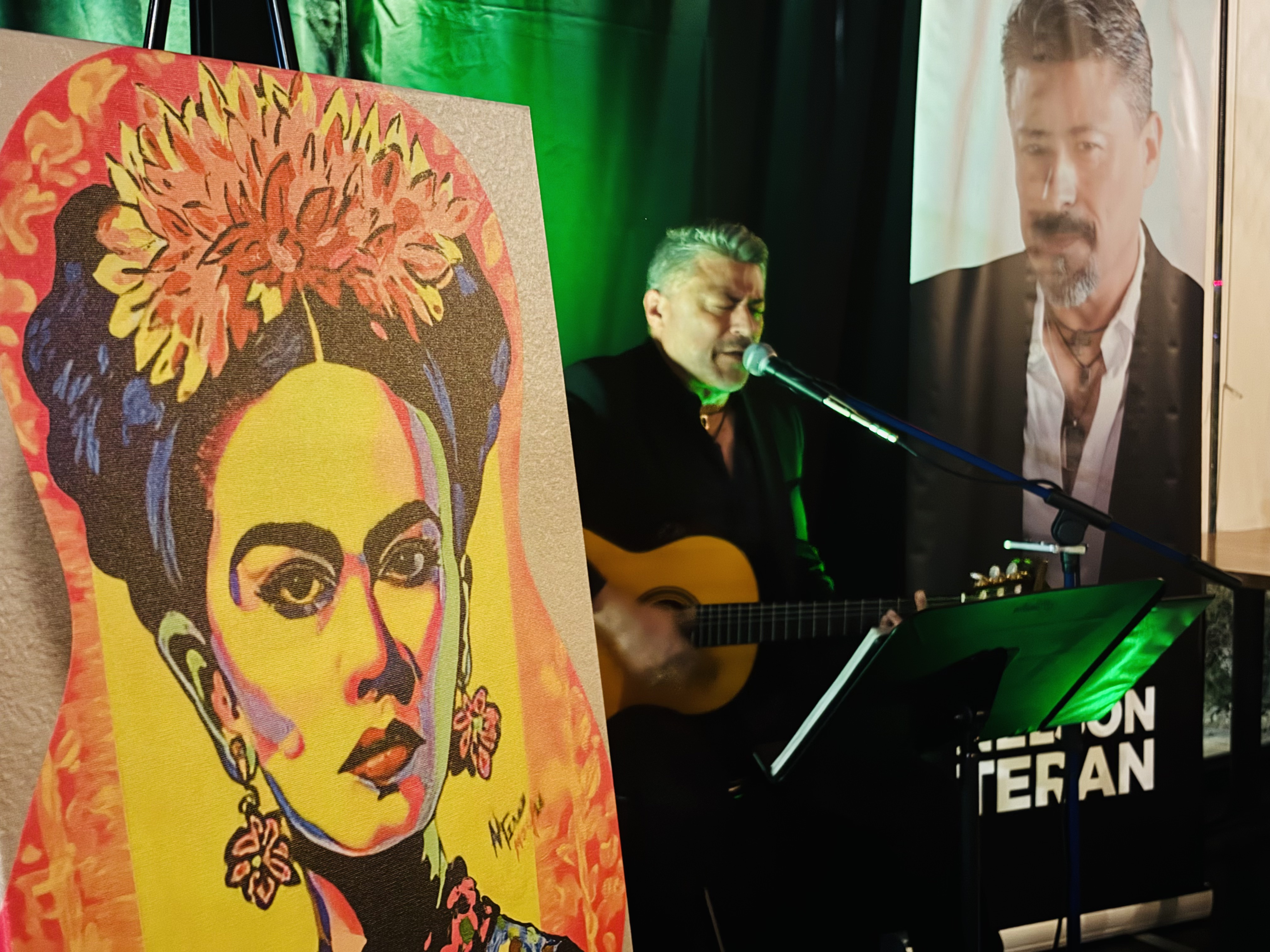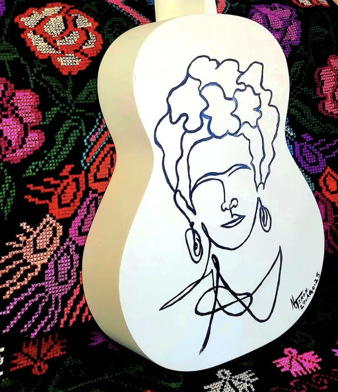 ARTE EN GUITARRAS… La guitarra, compañera de tiempo y camino del cantor, tras una vida de acordes, vuelve a nacer. En palabras de Nelson Teran, toda guitarra merece un final digno; por eso, cuando la guitarra parece que lo ha dado todo para la música y su vida productiva termina, vuelve a cobrar vida en sus manos. Nelson Teran pinta Fridas y Quijotes, en guitarras de madera, a mano alzada. Cada guitarra es única y es parte de una serie.